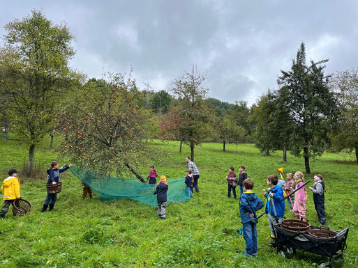 Nach einer regnerischen Woche zeigte sich das Wetter pünktlich von seiner besten Seite. Gemeinsam wurden Äpfel geerntet, gewaschen, geschnitten und mit einer Obstmühle zerkleinert, bevor sie in der mobilen Presse zu leckerem Apfelsaft verarbeitet wurden. Jedes Kind durfte eine Flasche des eigenen Safts mit nach Hause nehmen – natürlich mit einem selbstgestalteten Etikett.